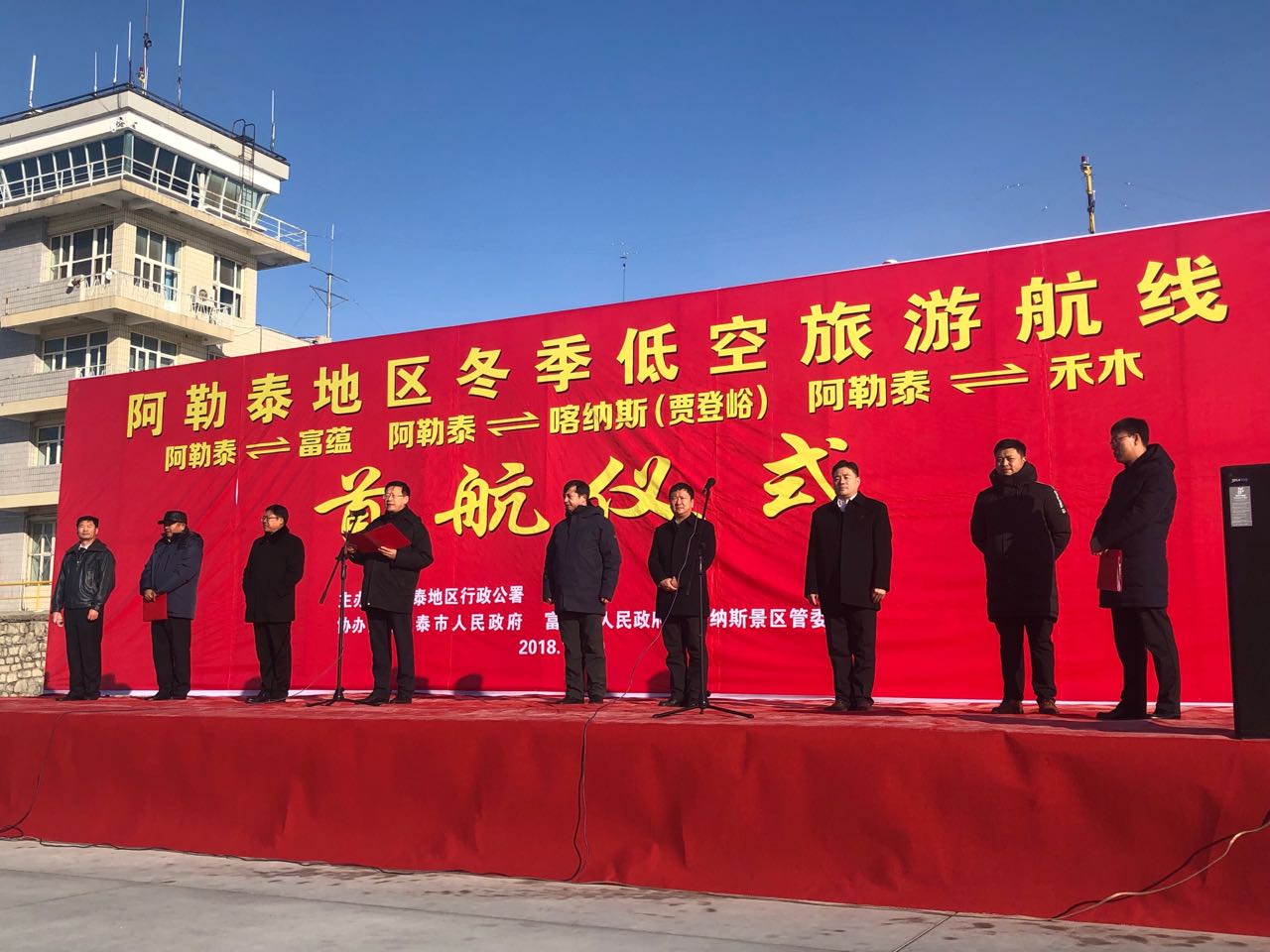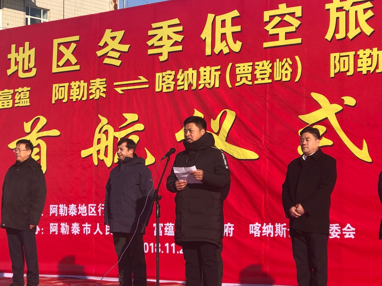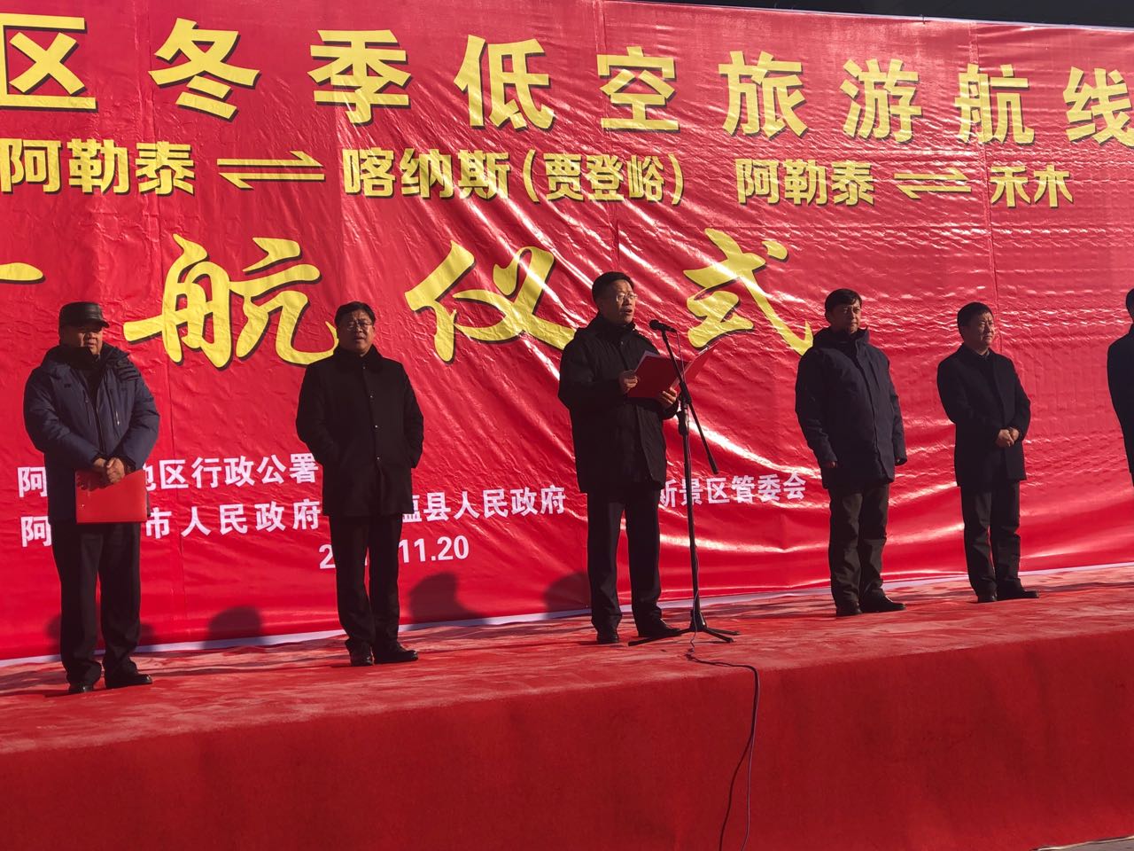 阿勒泰地委委員陳波在首航儀式上就如何進一步推動阿勒泰冬季旅游與通用航空業務的結合,借助空中游覽,打造阿勒泰地區冬季旅游新業態做出了重要講話。